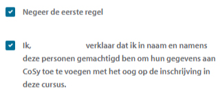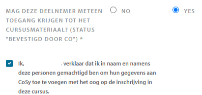 Onder de gegevens van de cursist klik je voor No of YES (Afhankelijk of je de cursist gelijk op de cursus wilt bevestigen, zodat de cursist direct bij het online cursusmateriaal kan) en zet je een vinkje voor de verklaring.